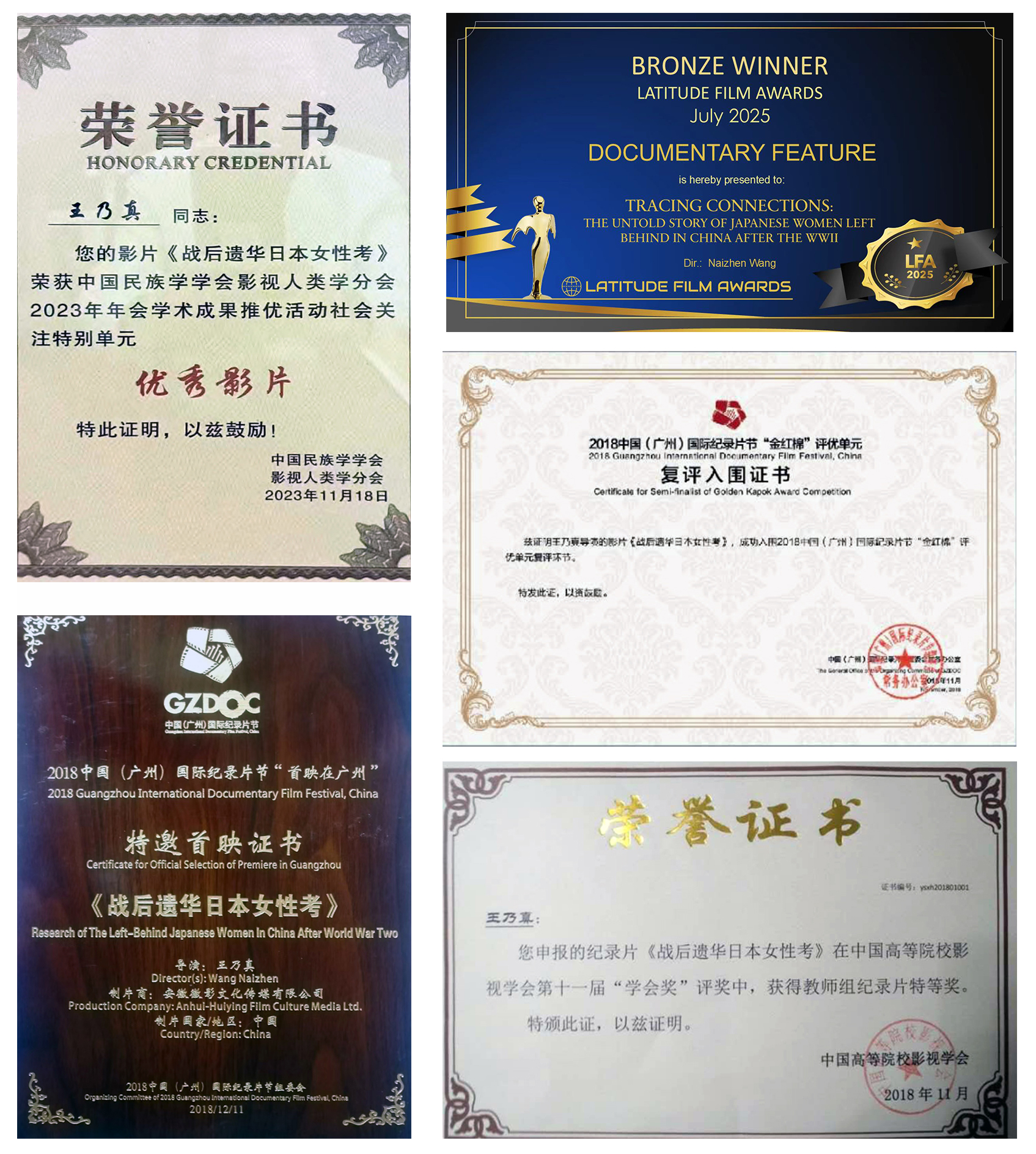 纪录电影《战后遗华日本女性考》既有荣誉展示(部分)