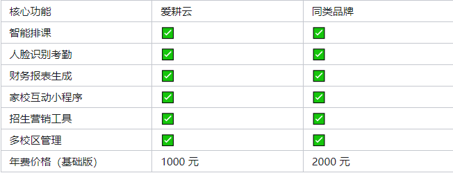 这种「把教师从琐事中解放」的价值,正是中小机构最迫切的需求。而价格仅为同类产品的 1/2 - 1/3,让爱耕云在性价比维度形成「断层领先」。